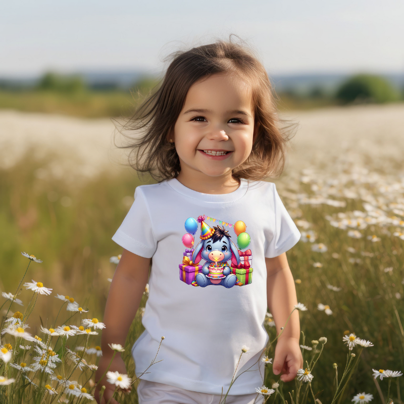 Adaugă bucurie și magie garderobei copilului tău cu acest tricou adorabil, perfect pentru sărbătorirea momentelor speciale! Realizat din bumbac 100% moale și confortabil, acest tricou unic îl prezintă pe Eeyore înconjurat de cadouri, baloane și un tort festiv, ideal pentru aniversări și evenimente memorabile. Perfect pentru micuții care iubesc personajele pline de tandrețe și distracție!